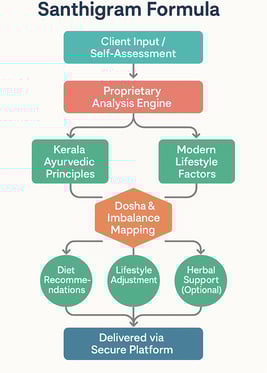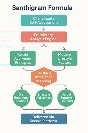 THE SANTHIGRAM Formula™, created by renowned Ayurvedic authority Dr. Ambika Nair and a team of expert Ayurvedic physicians, translates deep Ayurvedic intelligence into an actionable plan tailored to your specific body type, imbalances, and modern lifestyle.